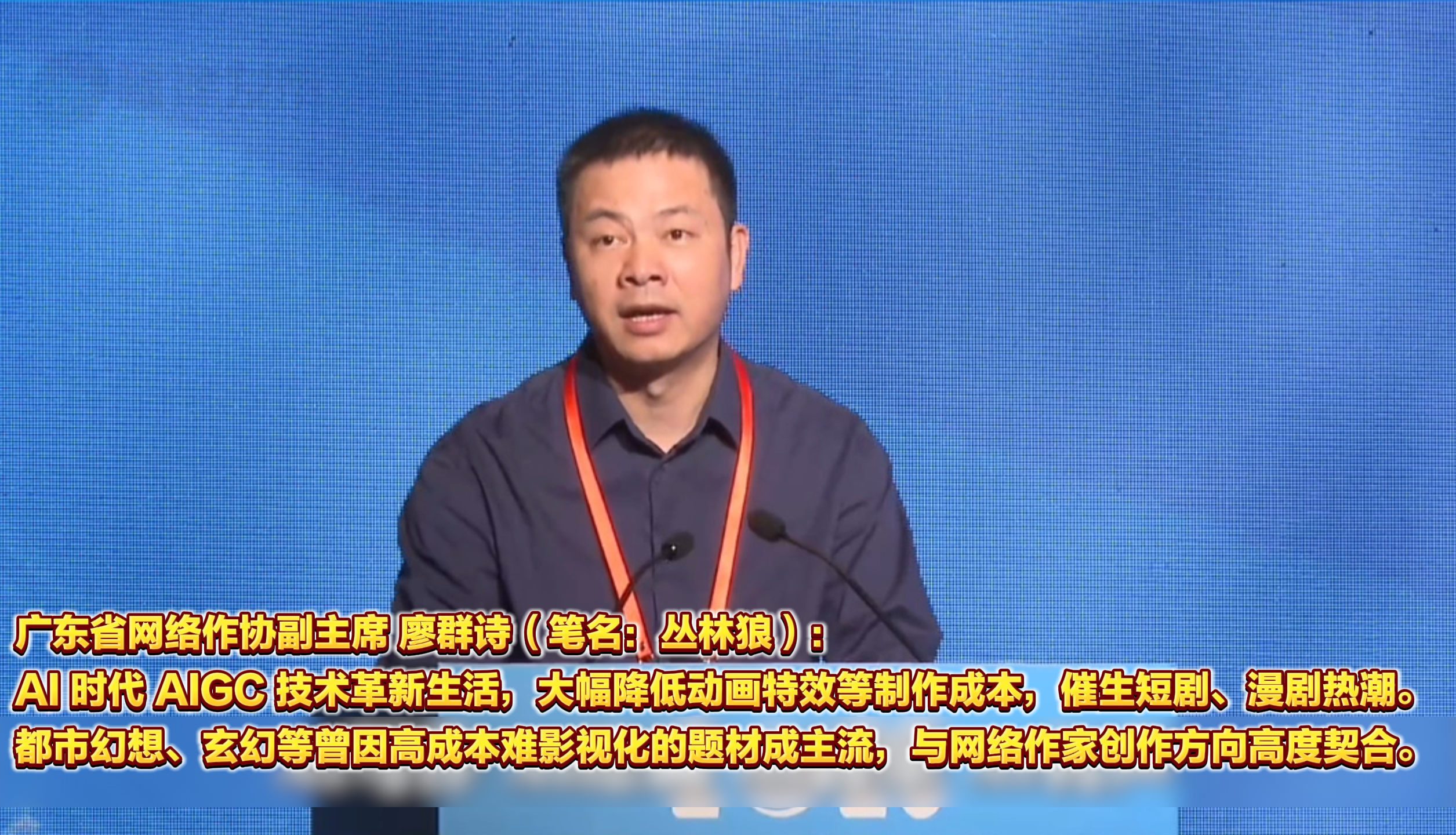 广东省网络作协副主席 廖群诗(笔名:丛林狼):AI 时代 AIGC 技术革新生活,大幅降低动画特效等制作成本,催生短剧、漫剧热潮。都市幻想、玄幻等曾因高成本难影视化的题材成主流,与网络作家创作方向高度契合。