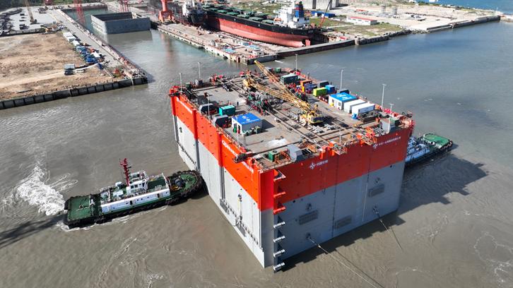 厦金大桥工程首个超大型锚碇钢沉井在泉州出坞