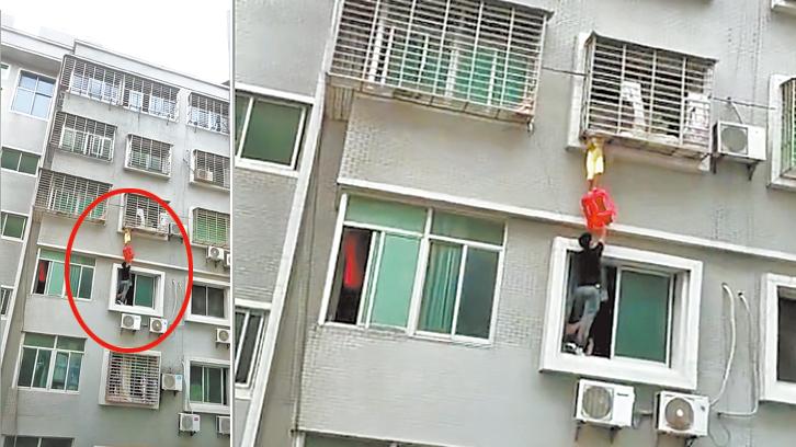 孩子头卡防盗窗挂在7楼 小伙踏出窗台举凳救人