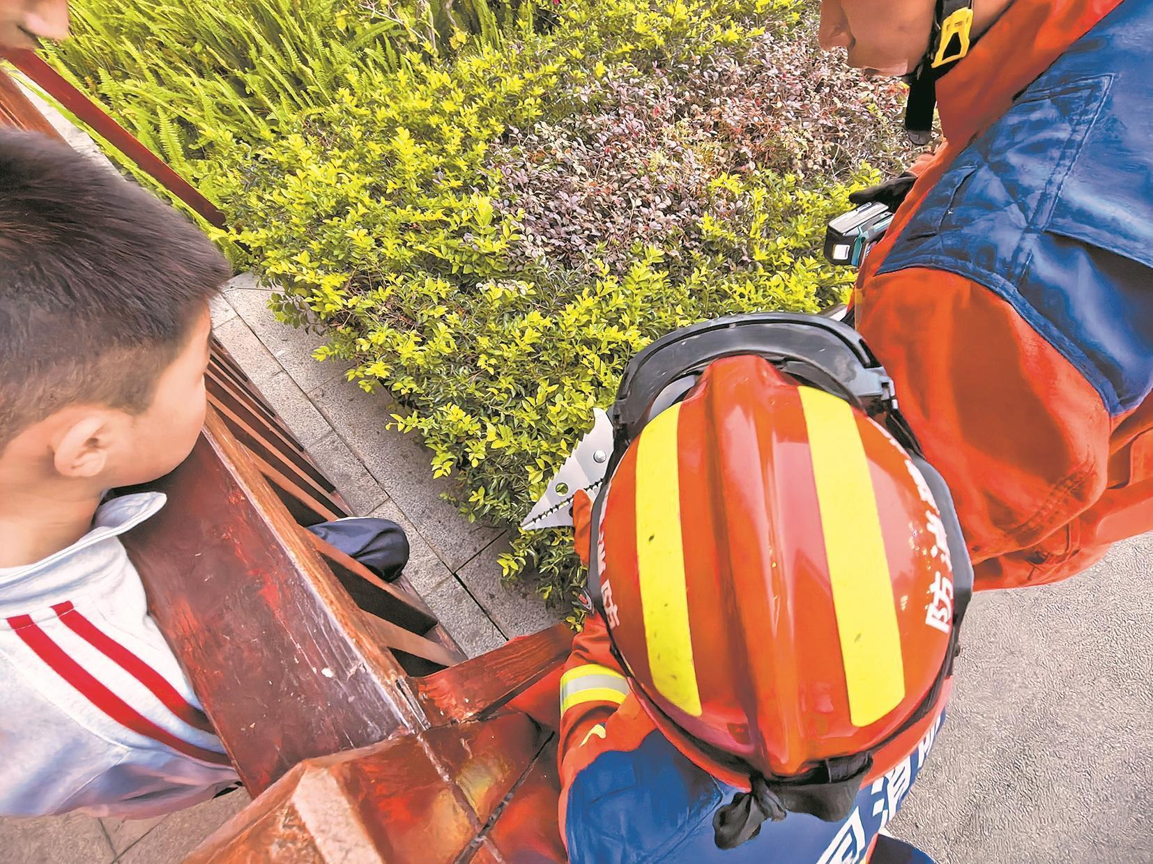 孩子贪玩脚卡木栏 消防救援1分钟脱困