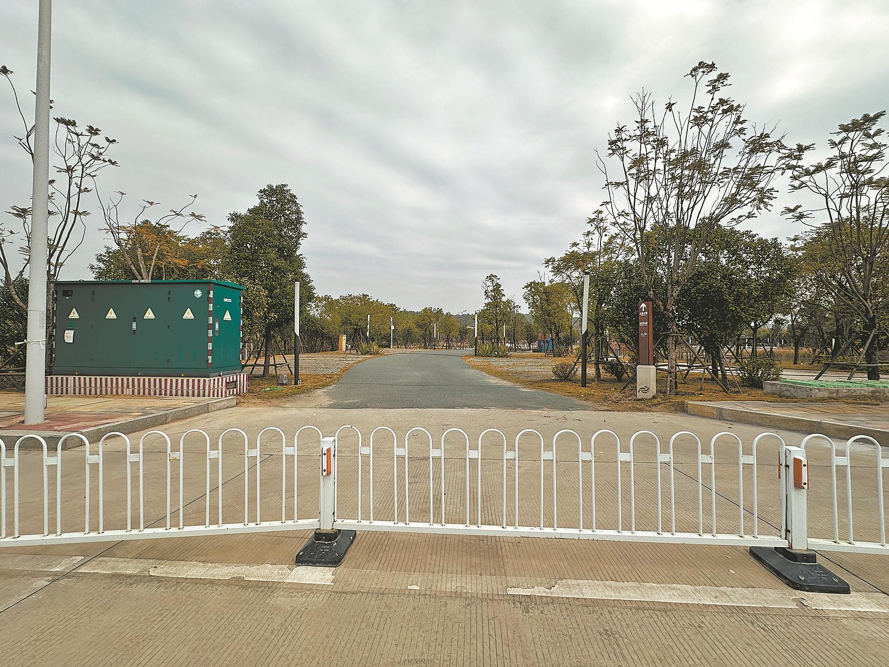 洛江区阳江新城公园:停车场入口护栏挡道 步道尽头枯树叶堆积